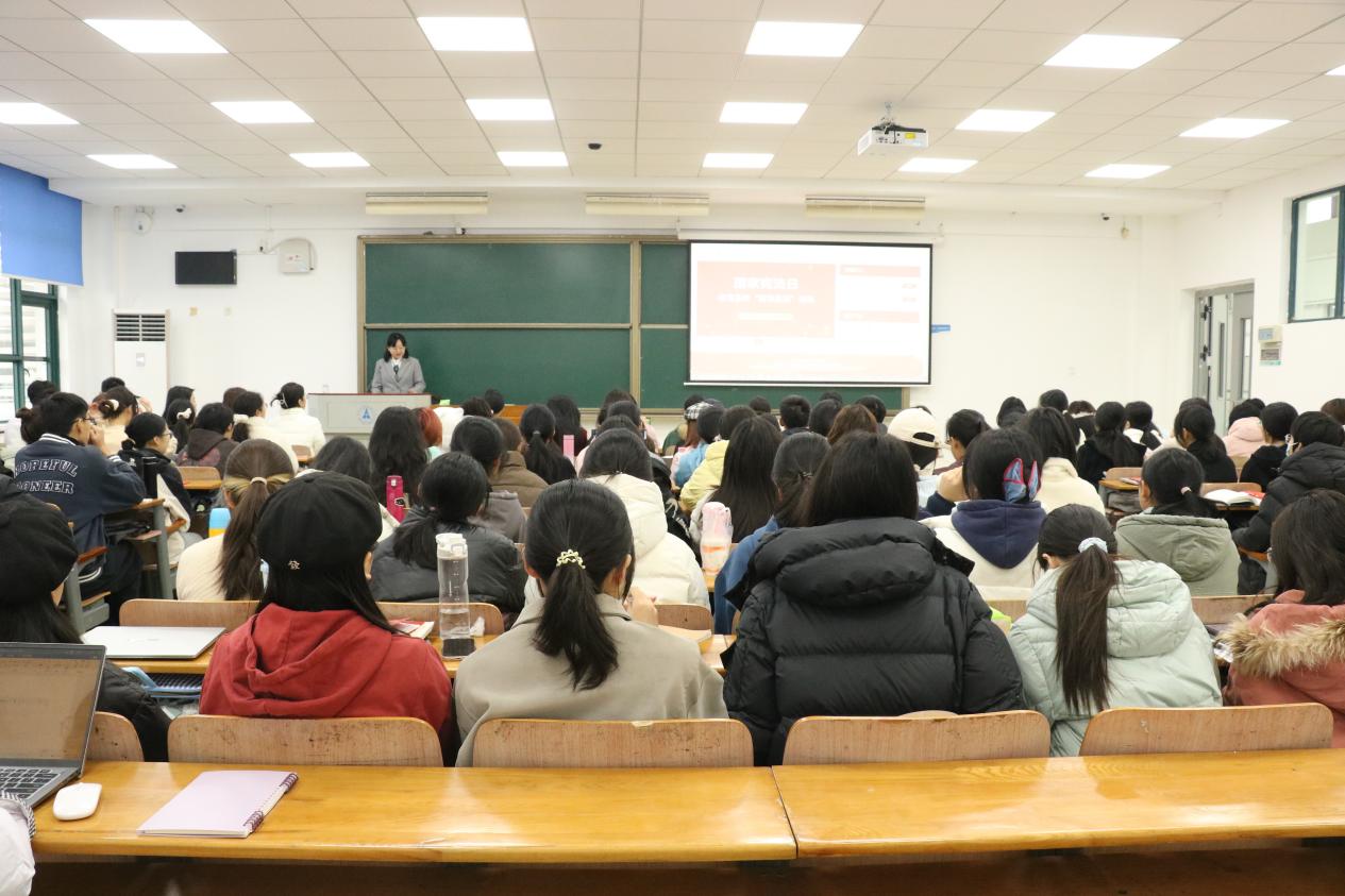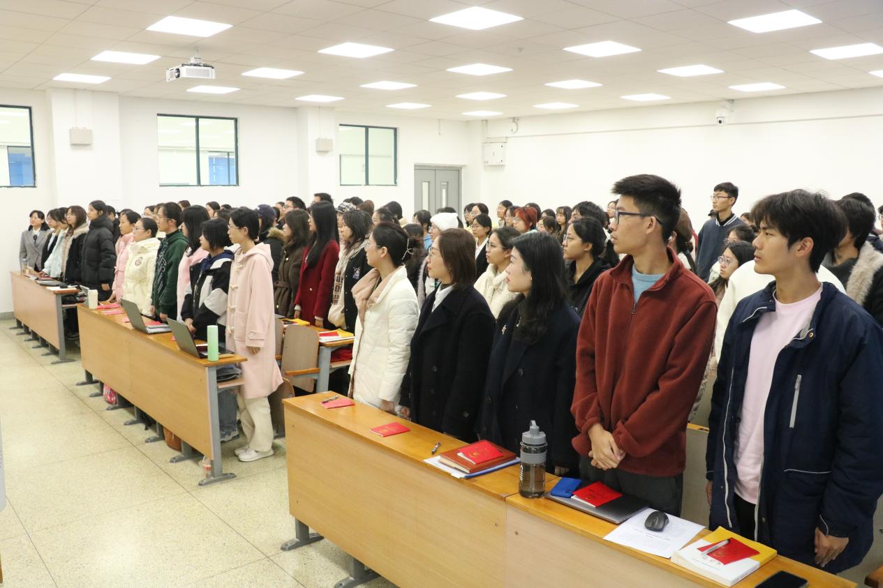 青春擎旗迎旭日,众口同音和国歌。本次活动在庄严的升旗仪式中拉开帷幕。上午十时整,文泰楼502教室内的师生通过网络直播与北京主会场实时联动,共同参与了这一庄严的仪式。当直播画面中国旗护卫队迈着铿锵步伐出场时,全场师生肃然起立;伴随着雄壮的国歌声响起,在场师生面向屏幕上冉冉升起的五星红旗行注目礼,齐声高唱国歌。这无疑是一堂无声却深刻的沉浸式思政大课,它通过最庄重的仪式展示了宪法所确立的国家象征,激发并凝聚了学生对国家的认同感和自豪感,将宏大的国家叙事融入青年一代学生的成长记忆。