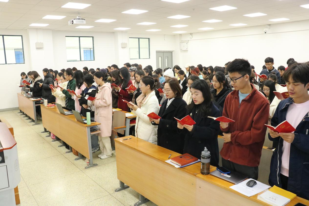 专题网讯(通讯员 齐笑 江登琴 摄影 彭世学)为弘扬宪法精神,深化师生法治理念,在我国第十二个国家宪法日到来之际,我校于12月4日上午举行教育系统“宪法晨读”活动。本着常态化教育与场景化诵读的深度结合、理论认知与情感认同的紧密衔接,此次活动特意安排在法学院江登琴、周锐恒老师开设的《宪法学》课堂进行。政策研究与法治办公室万思露副主任、李杨老师、胡兰老师以及该课堂的125名同学通过北京主会场网络直播共同参与了此次活动。