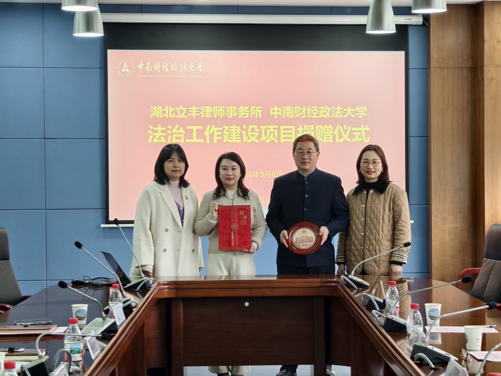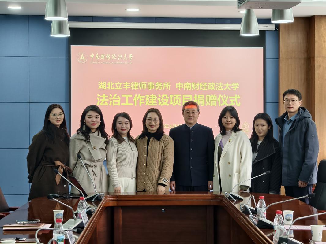 专题网讯(通讯员 孙佳怡)3月6日上午,湖北立丰律师事务所——中南财经政法大学法治工作座谈会暨法治工作建设捐赠仪式在南湖校区中原楼三楼会议室举行。湖北立丰律师事务所高级合伙人、管委会副主任兼业务运营中心主任邹艺,高级合伙人、立丰研究院副院长汪群,律师、2014级校友冯博文,律师陈君丽出席仪式。中南财经政法大学校友工作与社会合作部副部长、教育发展基金会副秘书长饶丹雪,政策研究与法治办公室副主任万思露,法治科科长李杨、法治科八级职员胡兰参与捐赠仪式。仪式由万思露副主任主持。